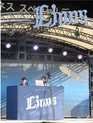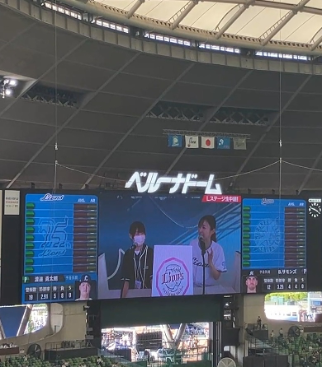 また、試合前には、LステージにおいてスタジアムMCのYUUMI様と当事業団放射線技師による乳がん検診に関する対談が行われました。この模様はドーム内にも同時中継され、ピンクリボン運動の趣旨や乳がん検診の方法等について広くご紹介することができました。